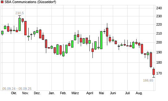 Mit dem Rücksetzer auf 171,05 EUR hat die SBA Communications-Aktie (ISIN US78410G1040) am 04.09.2025 ein neues 5-Jahres-Tief erreicht und damit den Kurs vom 27.05.2024 ...weiterlesen