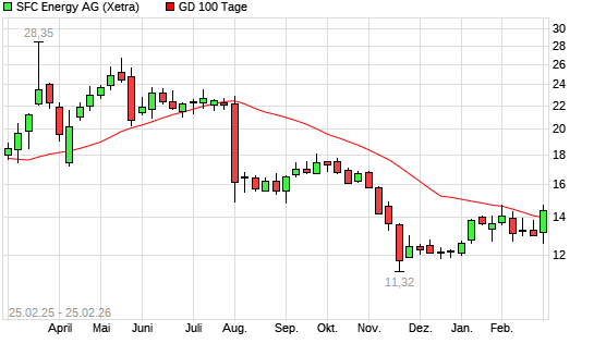 Mit dem Anstieg auf 14,46 EUR hat die SFC Energy-Aktie am 24.02.2026 die 100-Tage-Linie nach oben gekreuzt.Die SFC Energy-Aktie befindet sich seit dem 31.07.2025 im ...weiterlesen