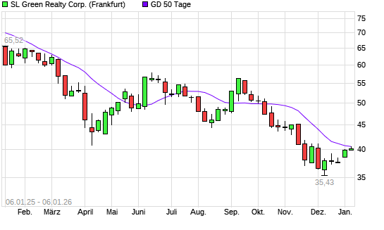 Mit dem Anstieg auf 40,53 EUR hat die SL Green Realty-Aktie am 05.01.2026 die 50-Tage-Linie nach oben gekreuzt.Die SL Green Realty-Aktie befindet sich seit dem 17.09.2025 im langfristigen Abwärtstrend ...weiterlesen