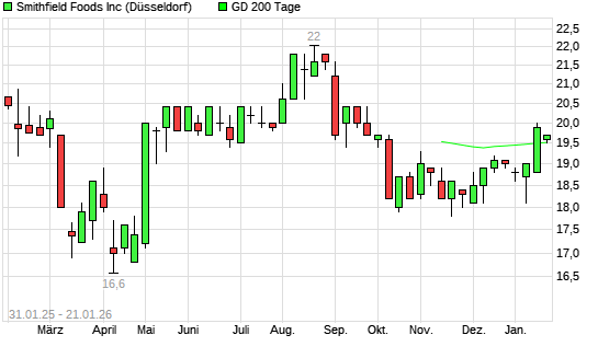 Mit dem Rücksetzer auf 19,40 EUR hat die SMITHFIELD FOODS-Aktie am 20.01.2026 die 200-Tage-Linie nach unten gekreuzt.Die SMITHFIELD FOODS-Aktie befand sich seit dem 14.01.2026 ...weiterlesen