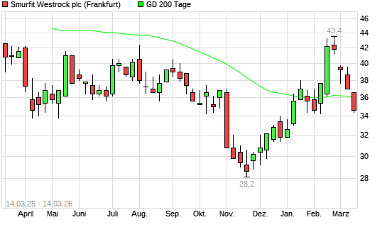 Mit dem Rücksetzer auf 34,60 EUR hat die SMURFIT WESTROCK-Aktie am 13.03.2026 die 200-Tage-Linie nach unten gekreuzt.Die SMURFIT WESTROCK-Aktie befand sich seit dem 10.03.2026 ...weiterlesen