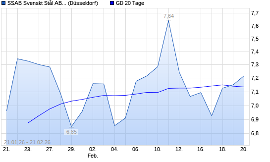 Mit dem Anstieg auf 7,19 EUR hat die SSAB AB -B- FRIA-Aktie am 20.02.2026 die 20-Tage-Linie nach oben gekreuzt.Die SSAB AB -B- FRIA-Aktie befindet sich seit dem 12.11.2025 im ...weiterlesen