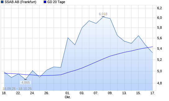 Mit dem Rücksetzer auf 5,33 EUR hat die SSAB-Aktie am 17.10.2025 die 20-Tage-Linie nach unten gekreuzt.Die SSAB-Aktie befindet sich seit dem 01.10.2025 im langfristigen Aufwärtstrend und ...weiterlesen