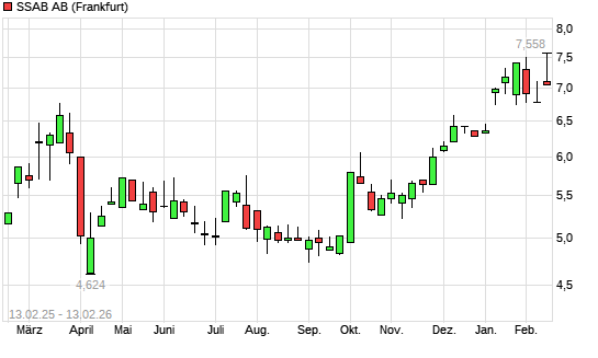 Mit dem Anstieg auf 7,56 EUR hat die SSAB-Aktie (ISIN SE0000171100) am 12.02.2026 ein neues 10-Jahres-Hoch erreicht und damit den Kurs vom 19.02.2024 eingestellt.Die SSAB-Aktie befindet sich ...weiterlesen