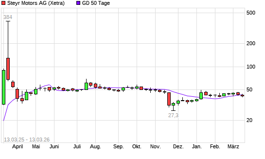 Mit dem Rücksetzer auf 42,30 EUR hat die STEYR MOTORS AG-Aktie am 12.03.2026 die 50-Tage-Linie nach unten gekreuzt.Die STEYR MOTORS AG-Aktie befindet sich seit dem 04.11.2025 ...weiterlesen