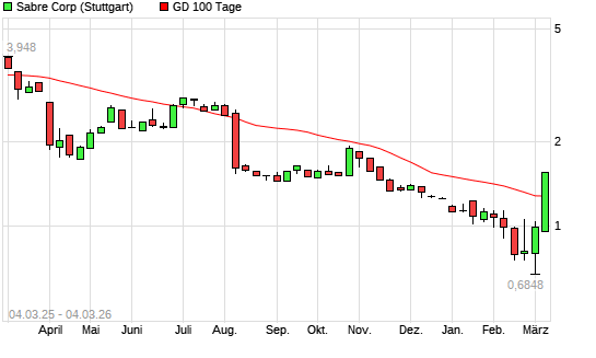 Mit dem Anstieg auf 1,38 EUR hat die Sabre-Aktie am 03.03.2026 die 100-Tage-Linie nach oben gekreuzt.Der Abstand zur 200-Tage-Linie beträgt aktuell -16,81%. Die ...weiterlesen