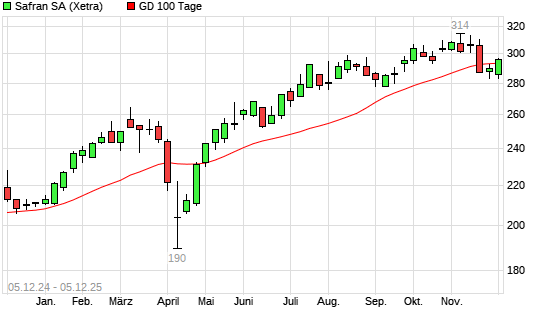 Mit dem Rücksetzer auf 293,00 EUR hat die Safran-Aktie am 04.12.2025 die 100-Tage-Linie nach unten gekreuzt.Die Safran-Aktie befindet sich seit dem 23.04.2025 im langfristigen Aufwärtstrend ...weiterlesen