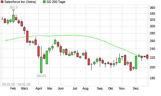 Mit dem Rücksetzer auf 221,95 EUR hat die Salesforce-Aktie am 09.01.2026 die 20-Tage-Linie nach unten gekreuzt.Die Salesforce-Aktie befindet sich seit dem 06.01.2026 im langfristigen Aufwärtstrend ...weiterlesen