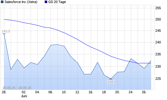 Mit dem Anstieg auf 232,25 EUR hat die Salesforce-Aktie am 27.06.2025 die 20-Tage-Linie nach oben gekreuzt.Die Salesforce-Aktie befindet sich seit dem 04.03.2025 im langfristigen Abwärtstrend ...weiterlesen