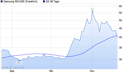 Mit dem Rücksetzer auf 39,90 EUR hat die Samsung SDI-Aktie am 21.11.2025 die 38-Tage-Linie nach unten gekreuzt.Die Samsung SDI-Aktie befindet sich seit dem 14.10.2025 im langfristigen Aufwärtstrend ...weiterlesen