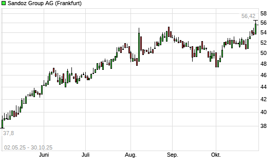 Mit dem Anstieg auf 55,80 EUR hat die Sandoz Group N-Aktie (ISIN CH1243598427) am 29.10.2025 ein neues All-Time-High erreicht und damit den Kurs vom 27.08.2025 eingestellt.Die Sandoz Group N-Aktie ...weiterlesen