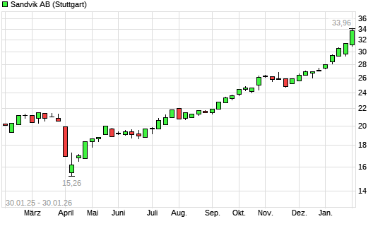 Mit dem Anstieg auf 33,70 EUR hat die Sandvik-Aktie (ISIN SE0000667891) am 29.01.2026 ein neues All-Time-High erreicht und damit den Kurs vom 28.01.2026 eingestellt.Die Sandvik-Aktie befindet ...weiterlesen