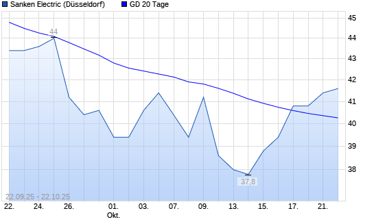 Mit dem Anstieg auf 41,60 EUR hat die Sanken-Aktie am 21.10.2025 die 20-Tage-Linie nach oben gekreuzt.Die Sanken-Aktie befindet sich seit dem 26.09.2025 im langfristigen Abwärtstrend und hat ...weiterlesen