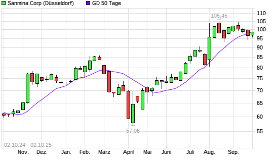 Mit dem Anstieg auf 98,68 EUR hat die Sanmina Corporation-Aktie am 01.10.2025 die 50-Tage-Linie nach oben gekreuzt.Die Sanmina Corporation-Aktie befindet sich seit dem 07.05.2025 im langfristigen ...weiterlesen