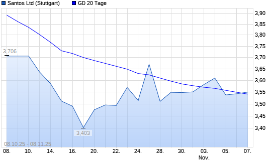 Mit dem Anstieg auf 3,55 EUR hat die Santos-Aktie am 07.11.2025 die 20-Tage-Linie nach oben gekreuzt.Die Santos-Aktie befindet sich seit dem 18.09.2025 im langfristigen Abwärtstrend und hat ...weiterlesen