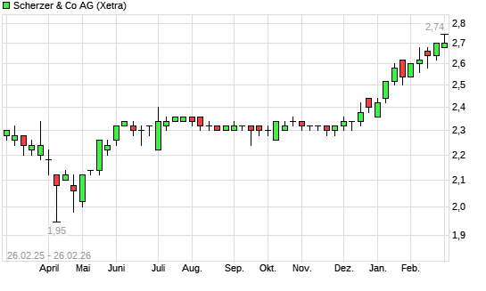 Mit dem Anstieg auf 2,72 EUR hat die Scherzer & Co.-Aktie (ISIN DE0006942808) am 25.02.2026 ein neues 12-Monats-Hoch erreicht und damit den Kurs vom 24.02.2026 eingestellt.Die Scherzer ...weiterlesen