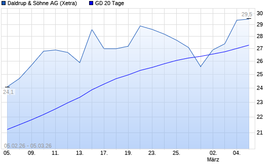 Mit dem Anstieg auf 27,00 EUR hat die Daldrup & Söhne-Aktie am 04.03.2026 die 20-Tage-Linie nach oben gekreuzt.Die Daldrup & Söhne-Aktie befindet sich seit dem 08.04.2025 ...weiterlesen