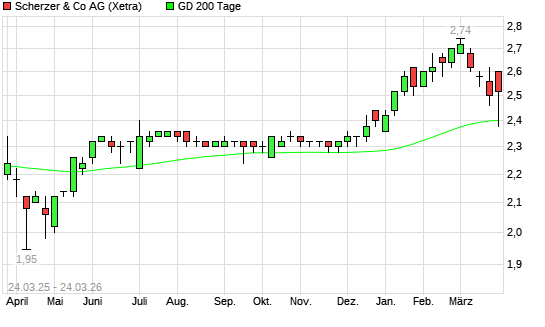 Mit dem Rücksetzer auf 2,34 EUR hat die Scherzer & Co.-Aktie am 23.03.2026 die 200-Tage-Linie nach unten gekreuzt.Die Scherzer & Co.-Aktie befand sich seit dem 29.09.2025 ...weiterlesen