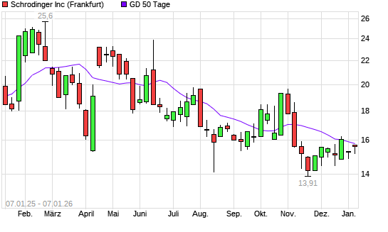 Mit dem Anstieg auf 15,61 EUR hat die Schrodinger-Aktie am 06.01.2026 die 50-Tage-Linie nach oben gekreuzt.Die Schrodinger-Aktie befindet sich seit dem 27.10.2025 im langfristigen Abwärtstrend ...weiterlesen