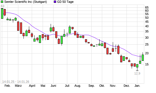 Mit dem Anstieg auf 20,20 EUR hat die Semler Scientific-Aktie am 13.01.2026 die 50-Tage-Linie nach oben gekreuzt.Der Abstand zur 200-Tage-Linie beträgt aktuell -22,49%.