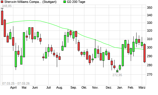 Mit dem Rücksetzer auf 290,50 EUR hat die Sherwin-Williams-Aktie am 06.03.2026 die 200-Tage-Linie nach unten gekreuzt.Die Sherwin-Williams-Aktie befand sich seit dem 03.02.2026 ...weiterlesen
