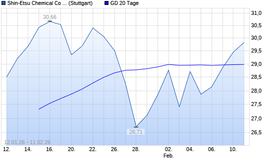Mit dem Anstieg auf 29,05 EUR hat die Shin-Etsu Chemical-Aktie am 10.02.2026 die 20-Tage-Linie nach oben gekreuzt.Die Shin-Etsu Chemical-Aktie befindet sich seit dem 30.01.2026 im langfristigen ...weiterlesen