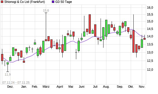 Mit dem Rücksetzer auf 13,90 EUR hat die Shionogi & Co-Aktie am 06.11.2025 die 50-Tage-Linie nach unten gekreuzt.Die Shionogi & Co-Aktie befindet sich seit dem 04.11.2025 ...weiterlesen