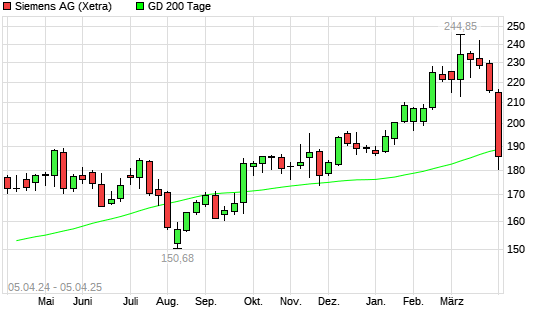 Mit dem Rücksetzer auf 182,66 EUR hat die Siemens-Aktie am 04.04.2025 die 200-Tage-Linie nach unten gekreuzt.Die Siemens-Aktie befand sich seit dem 25.09.2024 im langfristigen Abwärtstrend ...weiterlesen