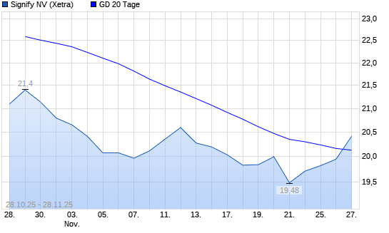 Mit dem Anstieg auf 20,32 EUR hat die Signify-Aktie am 27.11.2025 die 20-Tage-Linie nach oben gekreuzt.Die Signify-Aktie befindet sich seit dem 24.10.2025 im langfristigen Abwärtstrend und hat ...weiterlesen