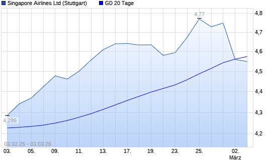 Mit dem Rücksetzer auf 4,55 EUR hat die Singapore Airlines-Aktie am 02.03.2026 die 20-Tage-Linie nach unten gekreuzt.Die Singapore Airlines-Aktie befindet sich seit dem 09.02.2026 ...weiterlesen