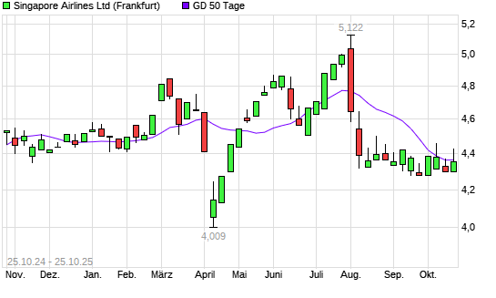 Mit dem Rücksetzer auf 4,35 EUR hat die Singapore Airlines-Aktie am 24.10.2025 die 50-Tage-Linie nach unten gekreuzt.Die Singapore Airlines-Aktie befindet sich seit dem 07.08.2025 im langfristigen ...weiterlesen