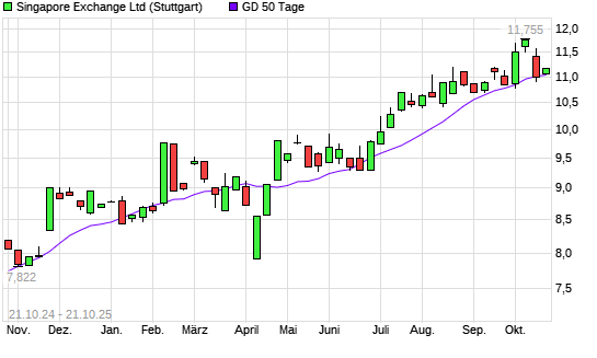 Mit dem Anstieg auf 10,97 EUR hat die Singapore Exchange-Aktie am 20.10.2025 die 50-Tage-Linie nach oben gekreuzt.Die Singapore Exchange-Aktie befindet sich seit dem 10.04.2025 im langfristigen ...weiterlesen