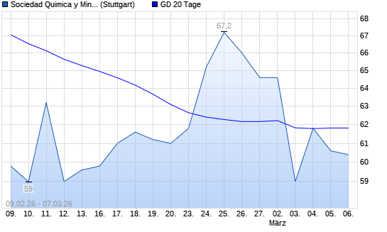 Mit dem Rücksetzer auf 60,40 EUR hat die Sociedad Quimica y Minera-Aktie am 06.03.2026 die 20-Tage-Linie nach unten gekreuzt.Die Sociedad Quimica y Minera-Aktie befindet sich seit ...weiterlesen
