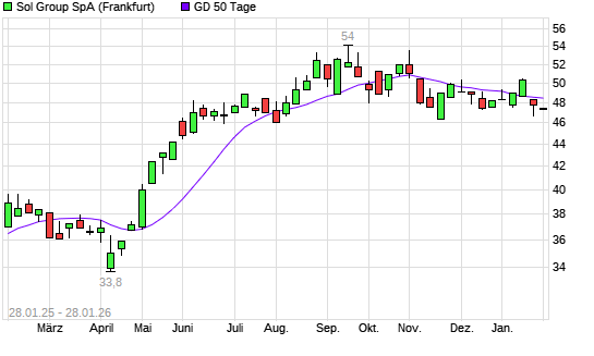 Mit dem Rücksetzer auf 47,40 EUR hat die Sol S.P.A.-Aktie am 27.01.2026 die 50-Tage-Linie nach unten gekreuzt.Die Sol S.P.A.-Aktie befindet sich seit dem 17.04.2025 im ...weiterlesen
