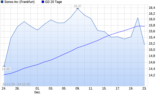 Mit dem Rücksetzer auf 15,16 EUR hat die Sonos-Aktie am 23.12.2025 die 20-Tage-Linie nach unten gekreuzt.Die Sonos-Aktie befindet sich seit dem 22.08.2025 im langfristigen Aufwärtstrend ...weiterlesen