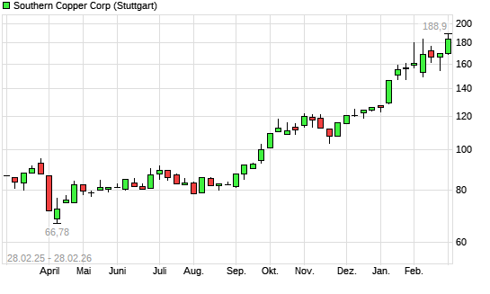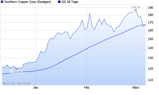 Mit dem Rücksetzer auf 165,25 EUR hat die Southern Copper-Aktie am 05.03.2026 die 38-Tage-Linie nach unten gekreuzt.Die Southern Copper-Aktie befindet sich seit dem 03.09.2025 ...weiterlesen