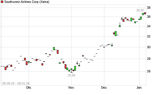 Mit dem Anstieg auf 36,28 EUR hat die Southwest Airlines-Aktie (ISIN US8447411088) am 07.01.2026 ein neues 3-Jahres-Hoch erreicht und damit den Kurs vom 06.01.2026 eingestellt.Die Southwest ...weiterlesen
