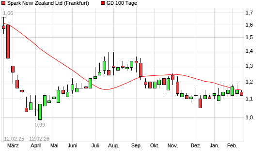 Mit dem Anstieg auf 1,15 EUR hat die Spark New Zealand-Aktie am 11.02.2026 die 100-Tage-Linie nach oben gekreuzt.Die Spark New Zealand-Aktie befindet sich seit dem 16.01.2026 im langfristigen ...weiterlesen