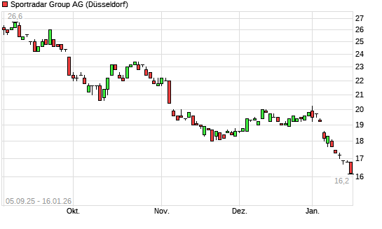 Mit dem Rücksetzer auf 16,90 EUR hat die Sportradar Group AG-Aktie (ISIN CH1134239669) am 15.01.2026 ein neues 6-Monats-Tief erreicht und damit den Kurs vom 14.01.2026 ...weiterlesen