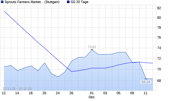 Mit dem Rücksetzer auf 68,24 EUR hat die Sprouts Farmers Market-Aktie am 11.12.2025 die 20-Tage-Linie nach unten gekreuzt.Die Sprouts Farmers Market-Aktie befindet sich seit dem 28.07.2025 ...weiterlesen