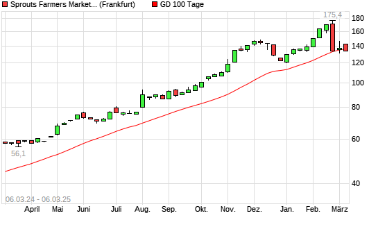 Mit dem Rücksetzer auf 133,80 EUR hat die Sprouts Farmers Market-Aktie am 05.03.2025 die 100-Tage-Linie nach unten gekreuzt.Der Abstand zur 200-Tage-Linie beträgt aktuell +20,45%. ##trendBox## Die ...weiterlesen