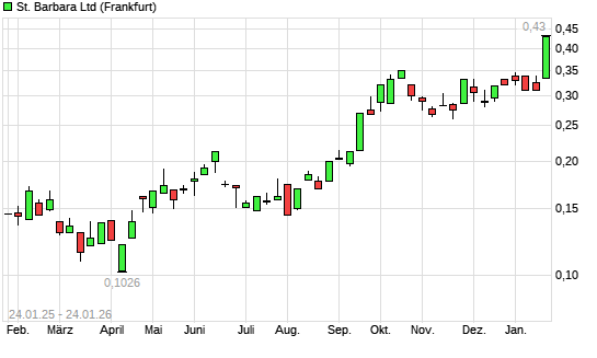 Mit dem Anstieg auf 0,43 EUR hat die St. Barbara-Aktie (ISIN AU000000SBM8) am 23.01.2026 ein neues 3-Jahres-Hoch erreicht und damit den Kurs vom 22.01.2026 eingestellt.Die St. Barbara-Aktie ...weiterlesen