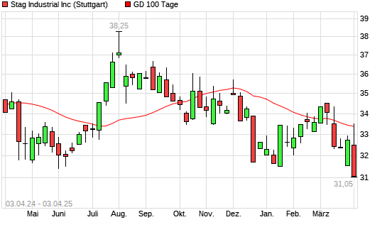 Mit dem Rücksetzer auf 33,28 EUR hat die Stag Industrial-Aktie am 02.04.2025 die 100-Tage-Linie nach unten gekreuzt.Die Stag Industrial-Aktie befindet sich seit dem 06.03.2025 ...weiterlesen