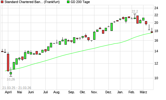 Mit dem Rücksetzer auf 17,70 EUR hat die Standard Chartered Bank-Aktie am 20.03.2026 die 200-Tage-Linie nach unten gekreuzt.Die Standard Chartered Bank-Aktie befand sich seit ...weiterlesen