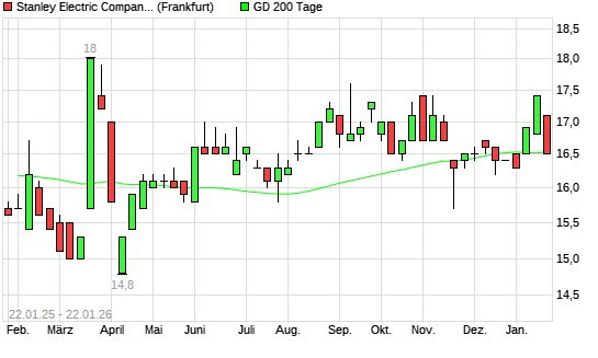 Mit dem Rücksetzer auf 16,50 EUR hat die Stanley Electric Company-Aktie am 21.01.2026 die 200-Tage-Linie nach unten gekreuzt.Die Stanley Electric Company-Aktie befand sich seit dem 05.01.2026 ...weiterlesen