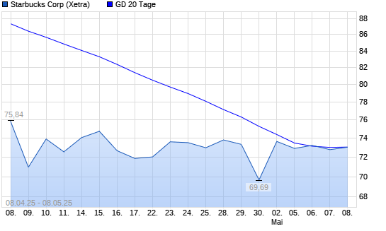Mit dem Anstieg auf 72,88 EUR hat die Starbucks-Aktie am 07.05.2025 die 20-Tage-Linie nach oben gekreuzt.Die Starbucks-Aktie befindet sich seit dem 03.04.2025 im langfristigen Abwärtstrend und ...weiterlesen