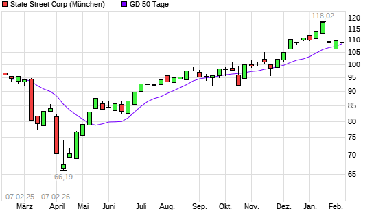 Mit dem Rücksetzer auf 108,62 EUR hat die State Street-Aktie am 06.02.2026 die 50-Tage-Linie nach unten gekreuzt.Die State Street-Aktie befindet sich seit dem 17.07.2025 im langfristigen ...weiterlesen