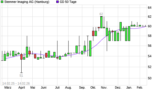 Mit dem Rücksetzer auf 60,00 EUR hat die Stemmer Imaging-Aktie am 13.02.2026 die 50-Tage-Linie nach unten gekreuzt.Die Stemmer Imaging-Aktie befindet sich seit dem 20.03.2024 im langfristigen ...weiterlesen