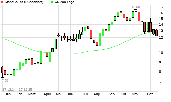 Mit dem Rücksetzer auf 12,65 EUR hat die Stoneco-Aktie am 16.12.2025 die 200-Tage-Linie nach unten gekreuzt.Die Stoneco-Aktie befand sich seit dem 11.12.2025 im langfristigen Aufwärtstrend ...weiterlesen