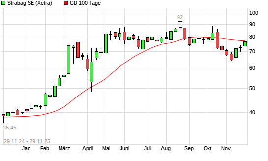 Mit dem Rücksetzer auf 76,60 EUR hat die Strabag SE-Aktie am 28.11.2025 die 100-Tage-Linie nach unten gekreuzt.Die Strabag SE-Aktie befindet sich seit dem 24.11.2025 im langfristigen Aufwärtstrend ...weiterlesen